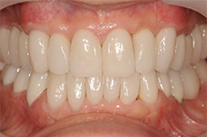 | かなり乱杭歯ですので、本来は矯正治療が良いのですが、事情により矯正ができない場合は、セカンドベストの治療としてラミネートベニアを行います。 | 完璧ではありませんが、かなりの所まで回復出来ています。 |